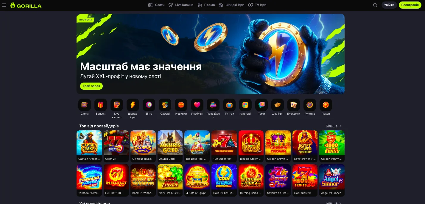 Онлайн казино Gorilla офіційно запустилось у вересні 2024 року та швидко завоювало увагу гравців завдяки щедрій бонусній програмі, великій колекції ігор та яскравому дизайну в стилі африканського сафарі.